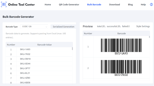 আমাদের বিনামূল্যে বাল্ক বারকোড জেনারেটর দিয়ে সেকেন্ডের মধ্যে বারকোড তৈরি করুন। এক্সেল SKU তালিকা থেকে কোড 128, UPC এবং EAN বারকোড তৈরি করুন একসাথে 100 পর্যন্ত, কোনও সফটওয়্যার প্রয়োজন নেই।