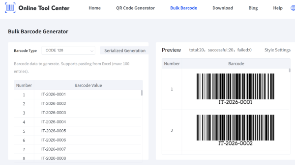 এক্সেল বা সিএসভি থেকে বাল্কে একাধিক বারকোড তৈরি করুন। বিনামূল্যে অনলাইন একাধিক বারকোড জেনারেটর কোড 128, EAN-13, UPC-A এবং মুদ্রণ-প্রস্তুত রপ্তানি ফরম্যাট সমর্থন কর